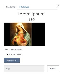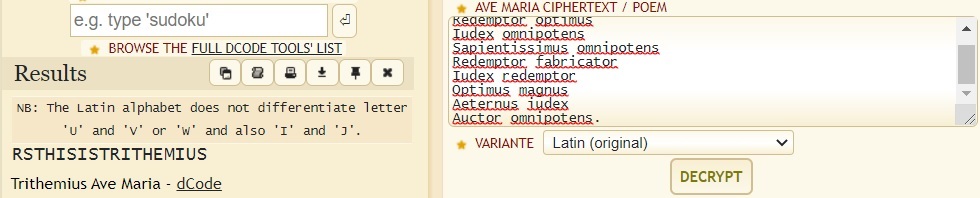 After a short search I saw that it was the *Trithemius Ave Maria* and using the [dcode](https://www.dcode.fr/enigma-machine-cipher) application i got the clear solution to which i added the curly brackets and changed some characters from uppercase to lowercase.