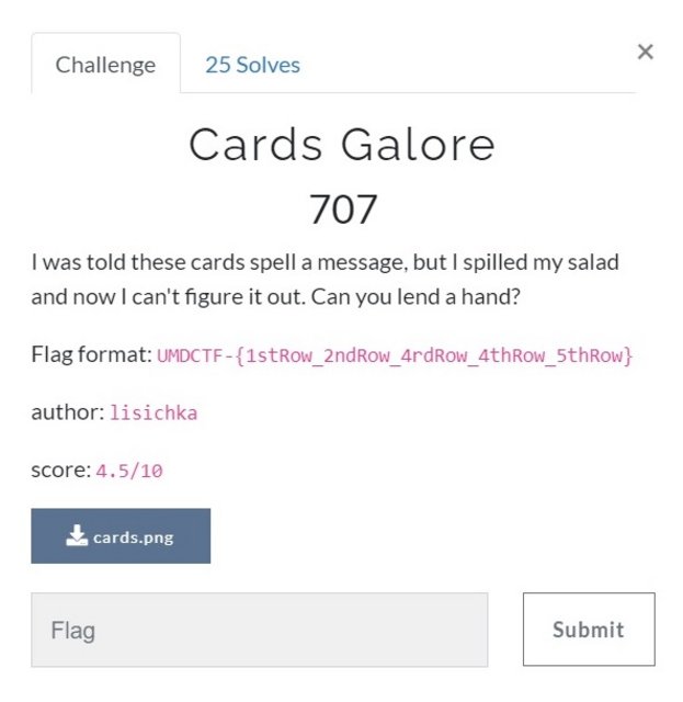`UMDCTF-{thanks_for_sorting_my_cards}`