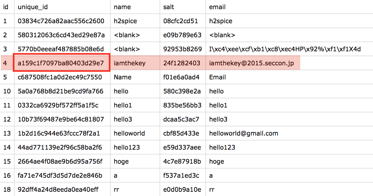 As a result, you can be able to take all the data of every user from table and it will be able to discover the unique_id of iahthekey @ 2015.seccon.jp account.