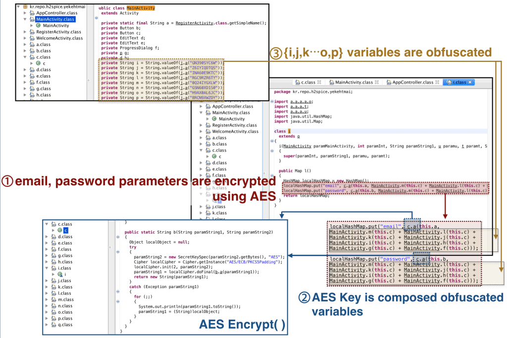 When Analyzed decompiled code , you will see that Seccon {…}Key uses uid(unique-id) to encrypt.Cut the uid as much [index i:index j] and use as AES key and ( i,j )variables are obfuscated.
