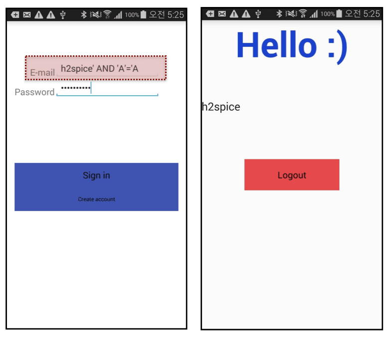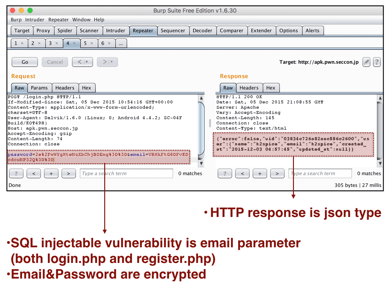 There is a possible degree of vulnerability to do SQL-Injection in Email parameter of Login.php and register.php.The problem should be resolved by Blind SQL Injection attack since Http response is delivered in Json type
