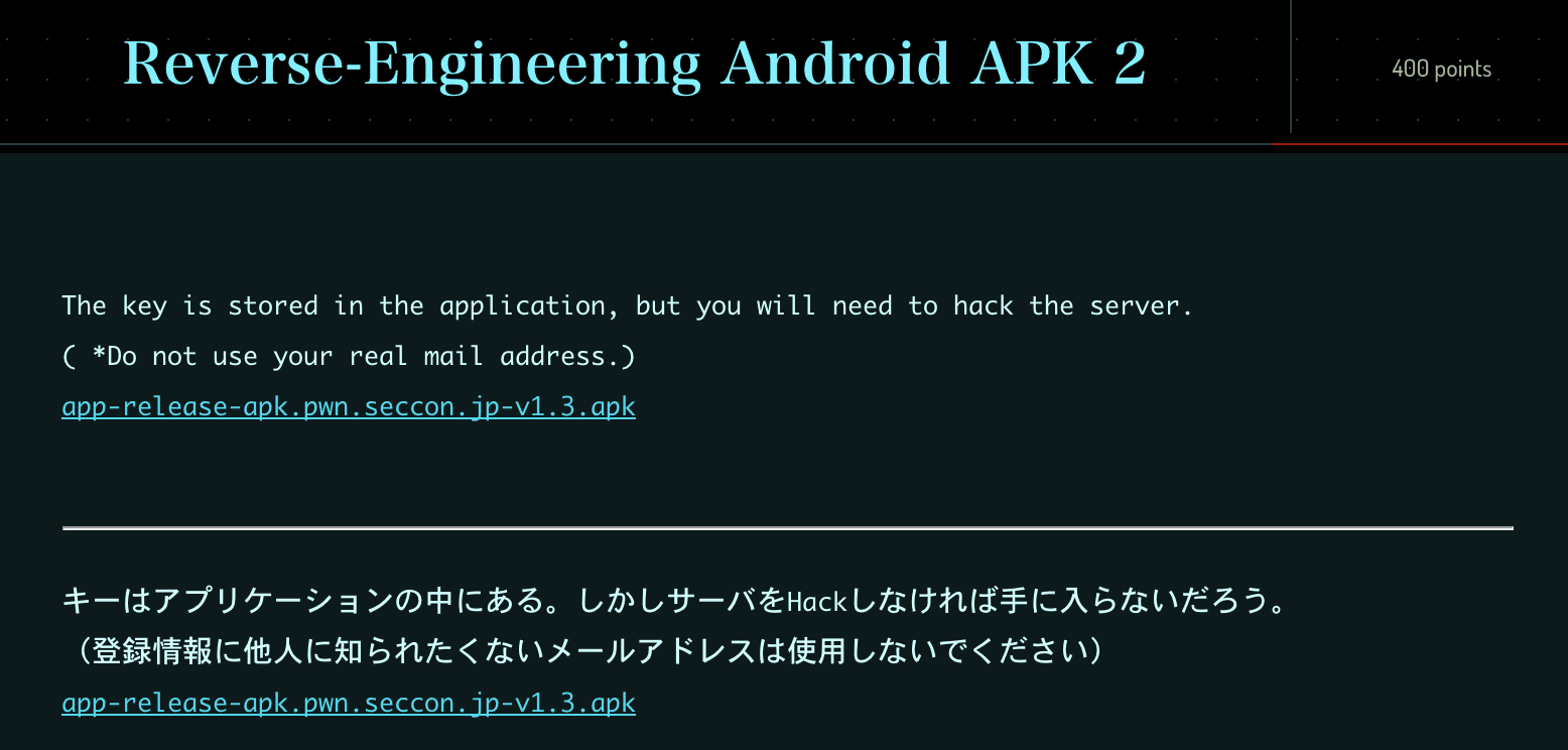SECCON{…} Key is belowh2spices-MacBook-Pro:Desktop h2spice$ python android400-decrypt.py