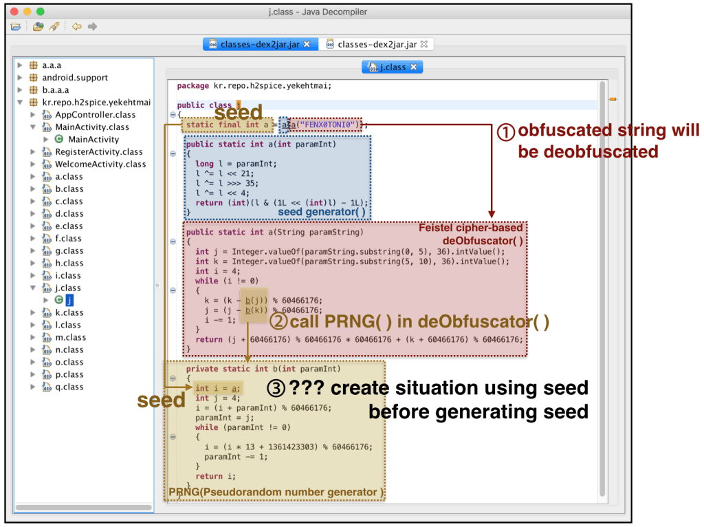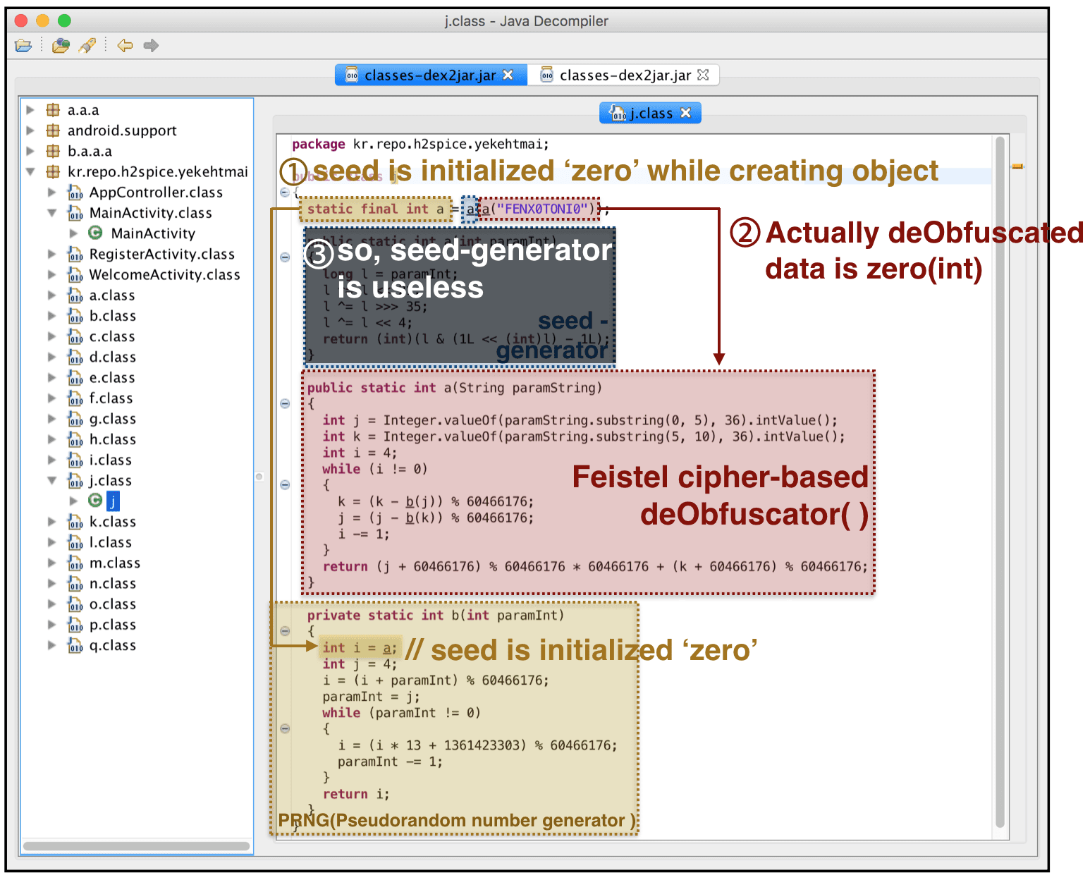 On the code above, “static final int a” is the Seed used for deObfuscator.Since deObfuscator calls PRNG(pseudorandom number generator) , PRNG( ) generates Random number refering seed.However here is a simple trap . It does pretend as if the “seed “is in situation even if it is not existed yet.