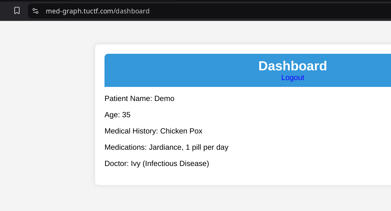 This challenge presented us with a simple web app for doctors & patients. No source code, only demo credentials (user: `Demo`, pass: `TUCTF`), so a little bit of exploration took place.